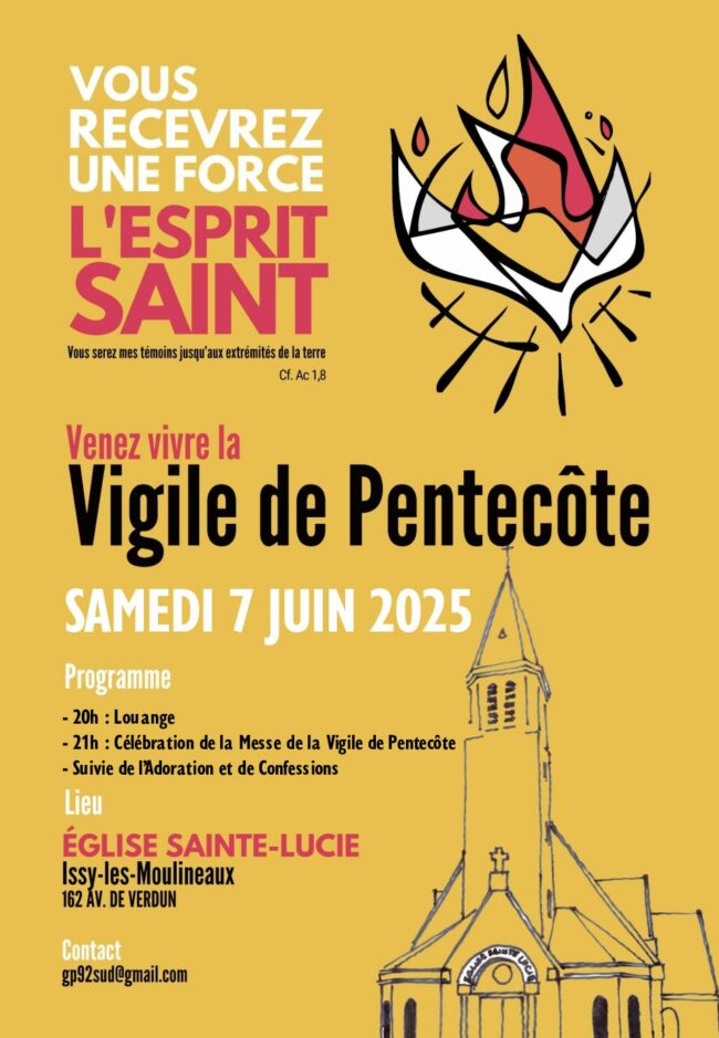 Venez vivre la Vigile de Pentecôte à Sainte-Lucie samedi 7 juin 2025 Programme: 20h: Louange 21h: célébration de la Messe de la Vigile de Pentecôte Suivie de l’Adoration et de Confessions Contact: gp92sud@gmail.com