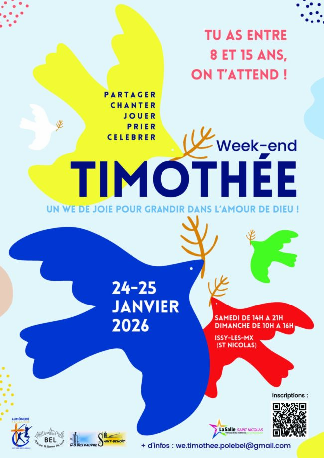 Un week-end de fête, de prière et de jeu, en petite équipe, pour grandir dans l’Amour de Dieu ! Ouvert à tous, le week-end Timothée suit une méthode éprouvée pour les jeunes dédiée à leur faire découvrir Jésus et les fondements de la foi chrétienne. Il aura lieu les 24 et 25 janvier 2026 dans les locaux de l’établissement St-Nicolas d’Issy-les-Moulineaux, et est…