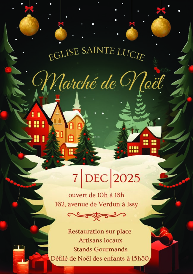 Dimanche 7 décembre Ouvert de 10h à 18h 162, avenue de Verdun à Issy Restauration sur place Artisans locaux Stands gourmands Defilé de Noël des enfants à 15h30 marché de noel Ste Lucie