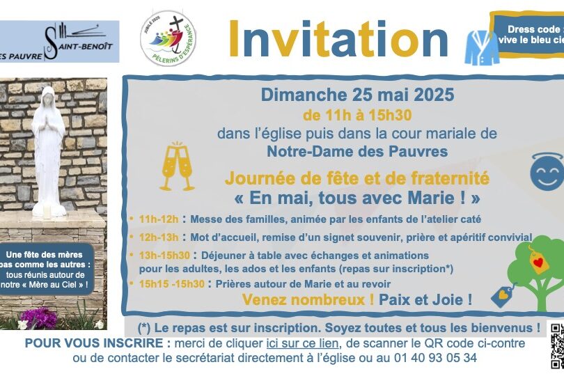 Dimanche 25 mai 2025 de 11h à 15h30 dans l’église puis dans la cour mariale de Notre-Dame des Pauvres
