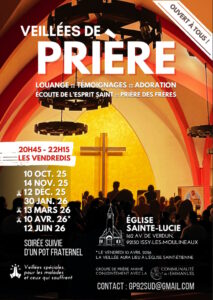 Chapelet pour les vocations suivi d’un temps d’adoration silencieuse le 2ème samedi du mois à 14h45.